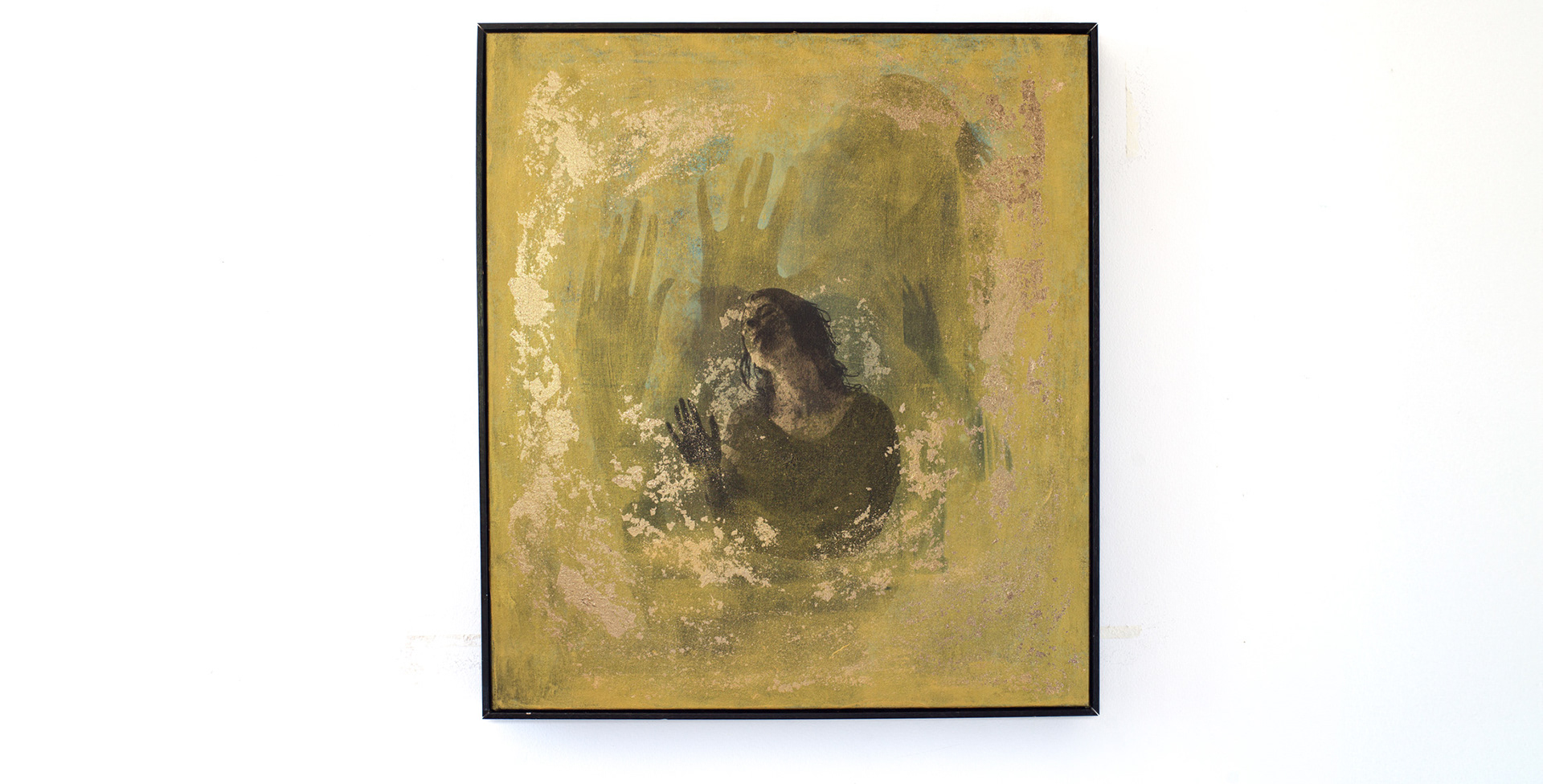 "SEIGT". 2025 - LAYERS OF PRINTED PHOTOGRAPHS ON ACRYLIC PAINT; GOLD LEAF COLLAGE.| 58cm x 48cm