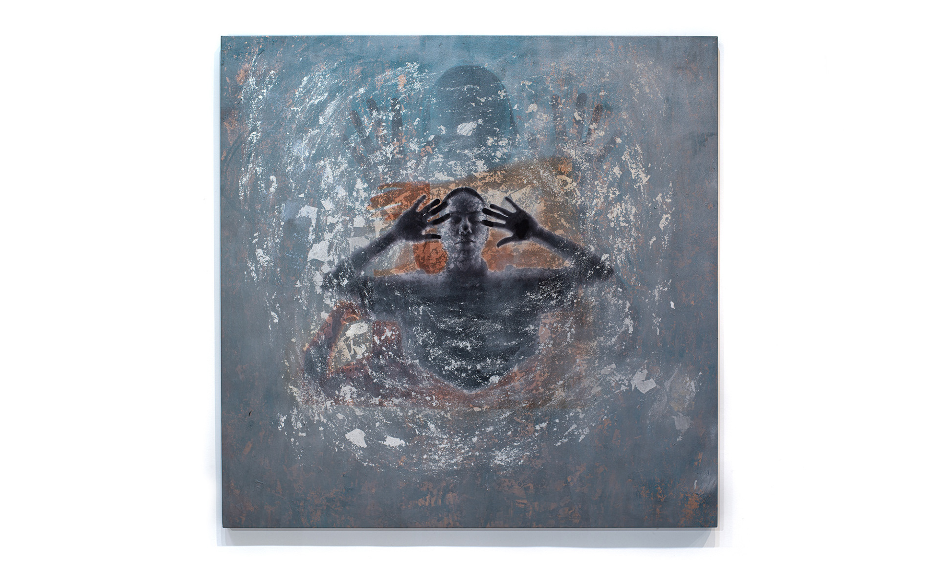 "TING". 2024 - LAYERS OF PRINTED PHOTOGRAPHS ON ACRYLIC PAINT ON CANVAS; SILVER LEAF COLLAGE.| 150cm x 150cm