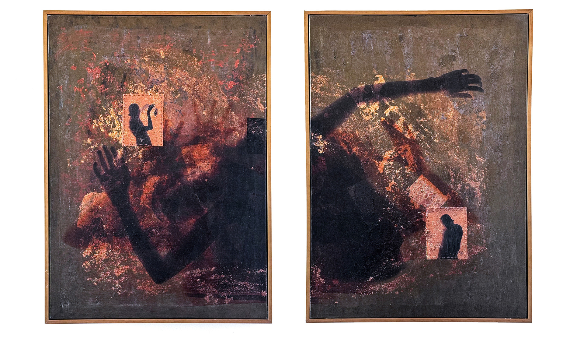 "AWAKEN", 2024 - DIPTYCH - MIXED MEDIA ON CANVAS: LAYERS OF PRINTED PHOTOGRAPHS ON ACRYLIC PAINT; GOLD LEAF COLLAGE; HAND-STITCHED CANVAS | 72cm x 52cm each