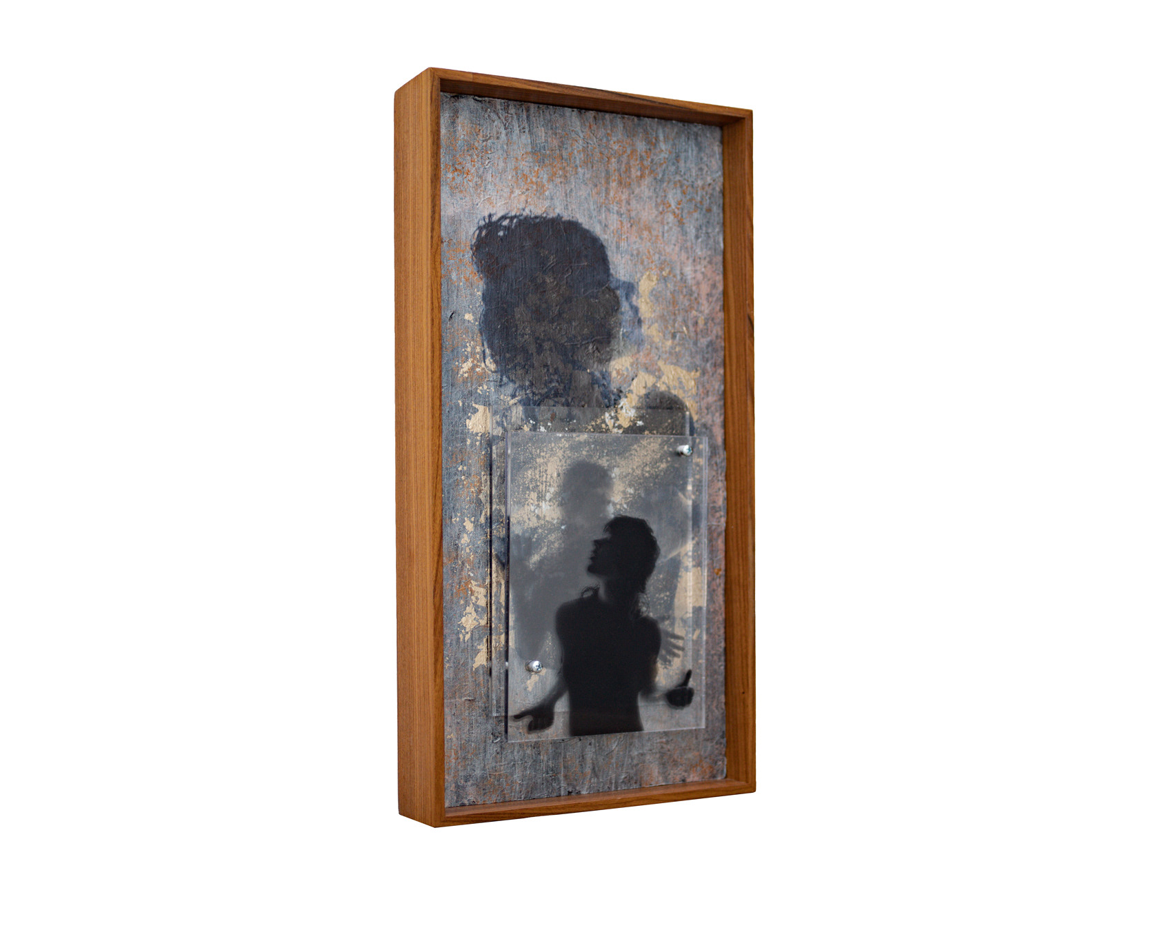 "PRISMA_T, 2025 - MIXED MEDIA: PRINTED PHOTOGRAPHS ON LAYERED TRANSLUCENT ACRYLIC; PRINTED PHOTOGRAPHS ON ACRYLIC PAINT; GOLD LEAF COLLAGE.. | 47cm x 24cm